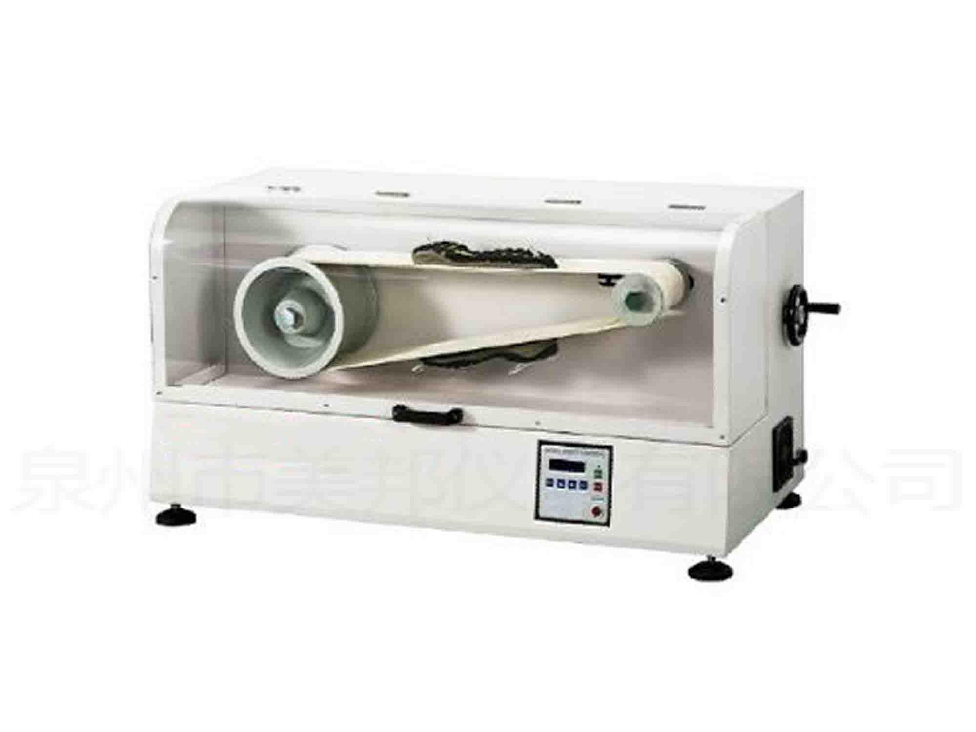 本機系用來試驗鞋底材料的在繞著滾筒上之傳動布帶上做循環(huán)測試,藉以觀察其耐彎曲的程度。動作是由大輪來的帶動小輪,以轉動傳動布帶。小轉輪有三種尺寸供替換與比較測試結果。