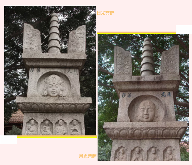 廣化寺的大殿廣場上立有兩座寶匣式經(jīng)幢塔,分別是日光菩薩塔和月光菩薩塔。