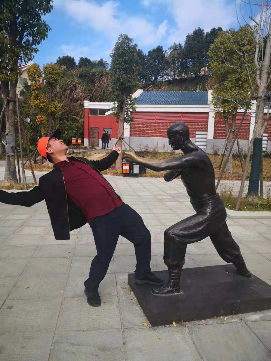 中午的12點42分到達了莆田南少林遺址,兩眼望去大門上刻著四個大字【南少林寺】,左邊還有幾座石雕像,都擺著打拳的姿勢,我們依然排好姿勢拍了幾張合照,從大門進入,我們來到了右側(cè),往里進入導(dǎo)游給我們介紹南少林的由來,墻壁上都是有關(guān)于南少林拳法以及莆田南少林寺的千年歷史;