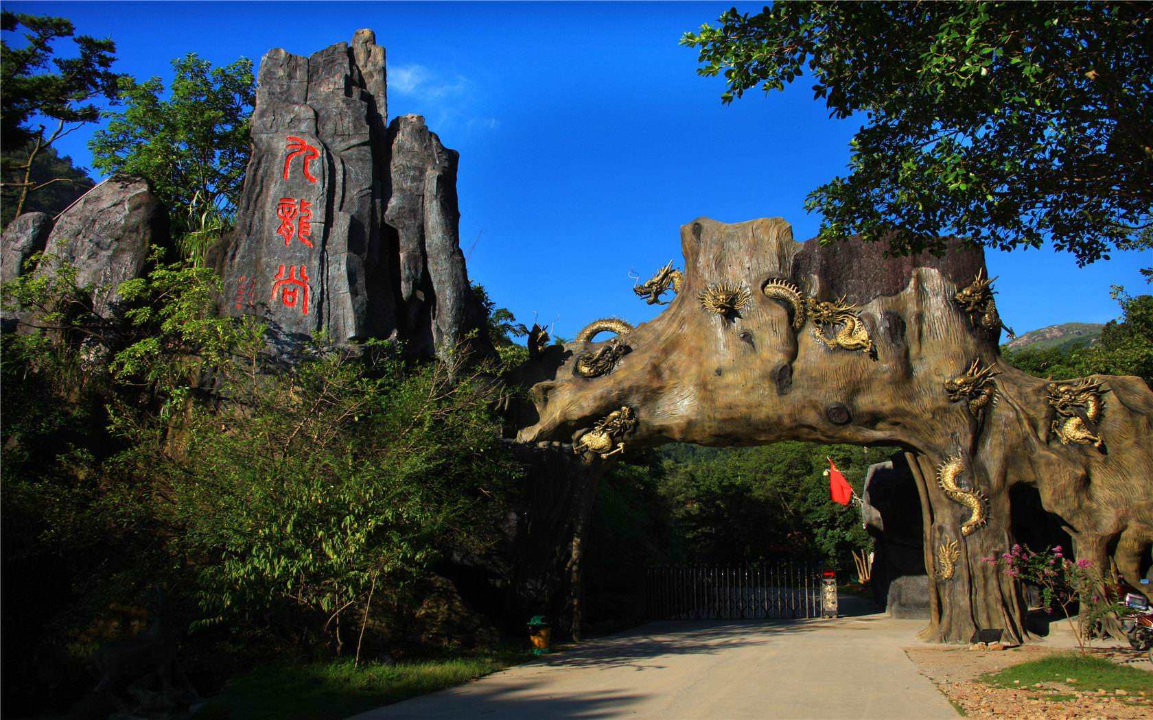 到達莆田九龍谷已是10:00,先是被它用樹干做的門給震住,據(jù)說是杉木,上面有毛澤東的字跡-神奇九龍谷,看兩旁濃綠色的青山穿過,絲絲涼風(fēng)吹過發(fā)端,夾雜空氣中清新的味道,那感覺真是沁人心脾。