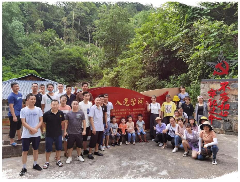 路的兩旁每隔一段路程,豎立著長征重大事件歷史記錄,紅軍革命歷史博物館外圍豎立著三面旗幟,隨風(fēng)飄蕩,讓人肅然起敬,往里走,有座土石疊成的房子,大門上掛著牌匾—【長征故事】,房子旁豎立著“不忘初心、牢記使命”以及“入黨誓詞”,之后我們進(jìn)行全體合照。