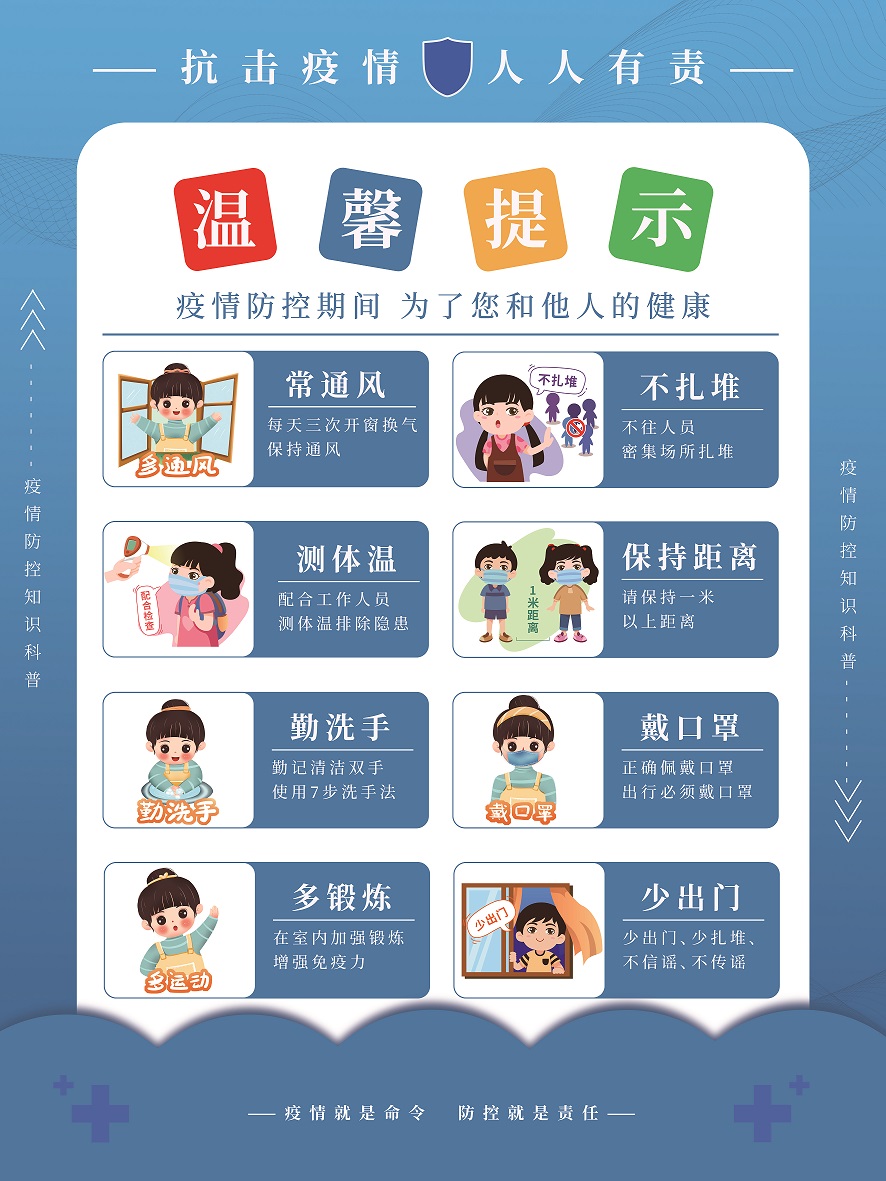 1、嚴格遵守疫情防控相關規(guī)定,切實履行疫情防控個人主體責任,假期不出門,減少聚集和跨市跨省流動,出行注意個人及同行人員的防護。