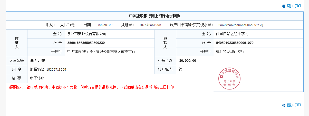 全球性經(jīng)濟(jì)寒冬,大家生活、發(fā)展都不易!西藏日喀則地區(qū)發(fā)生地震讓當(dāng)?shù)厝藗兏茄┥霞铀?!美邦儀器牢記使命,不忘初心!捐款3萬元略表心意!祝災(zāi)區(qū)人民早日恢復(fù)正常生活!